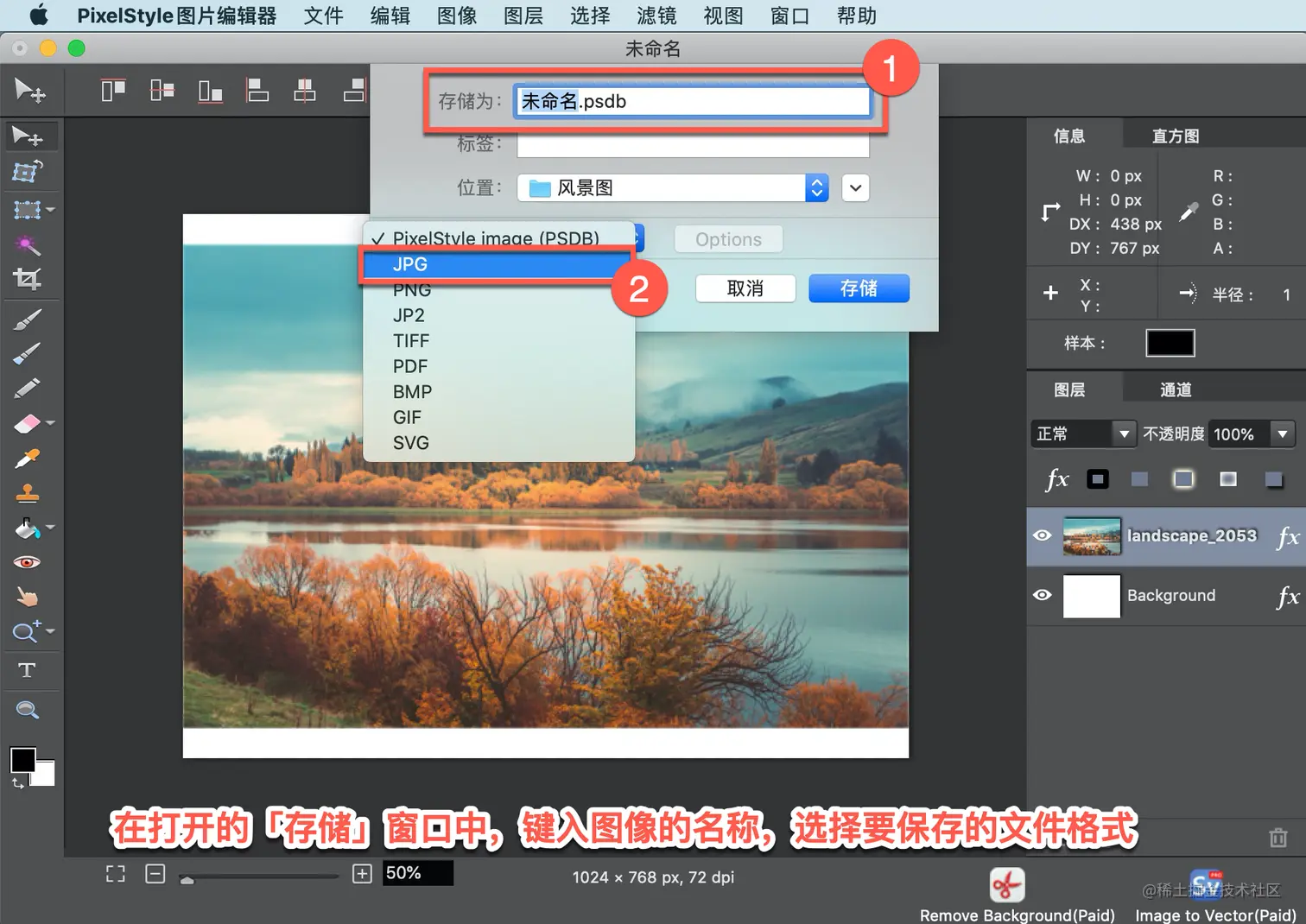 1. 如果您尚未编辑完成并希望下次无损打开该文件,请将文档另存为PixelStyle图像(PSDB)。